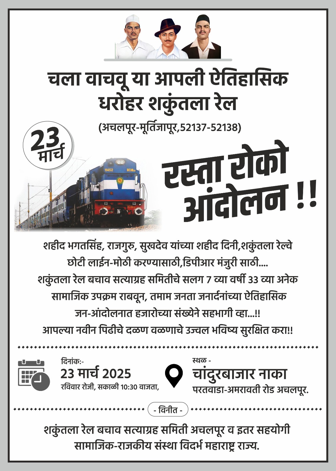 23 मार्चला शहीद दिनी होणाऱ्या या ऐतिहासिक आंदोलनाची सर्वांनी नोंद घ्यावी आणि शकुंतला ब्रॉडगेजच्या मागणीसाठी एकत्र यावे!