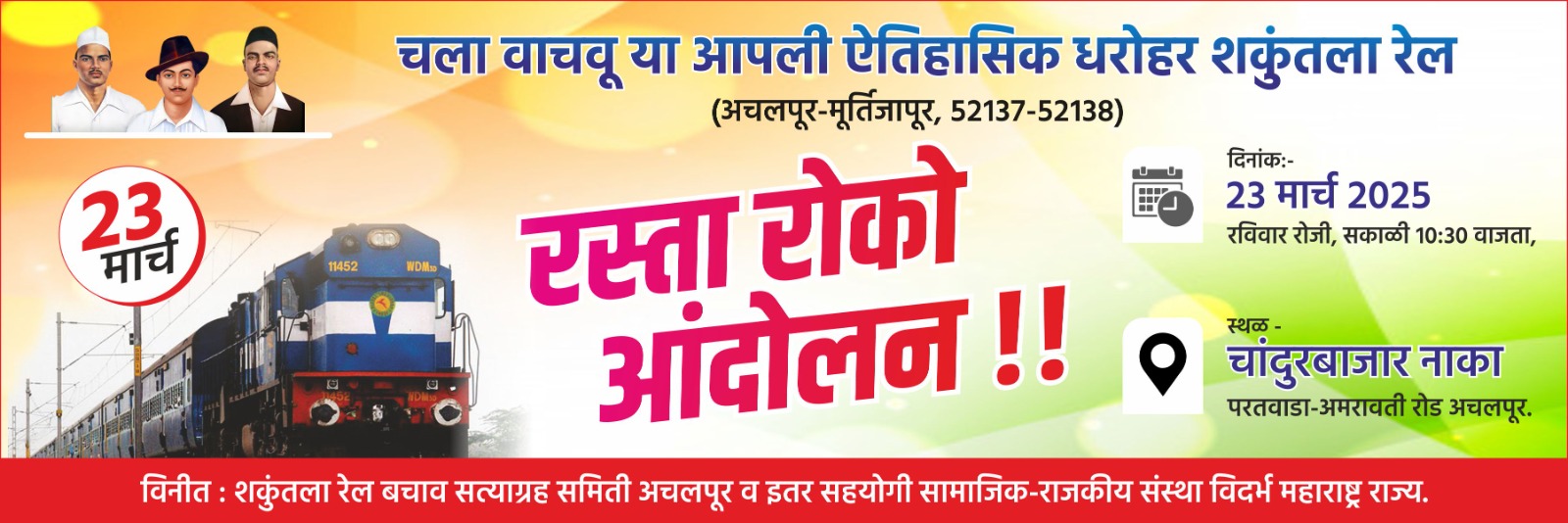 – गेल्या सात वर्षांपासून बंद असलेल्या शकुंतला रेल्वेच्या ब्रॉडगेज रूपांतरासाठी संघर्ष करणाऱ्या शकुंतला बचाव सत्याग्रह समितीने 23 मार्च 2025 रोजी शहीद दिनाच्या दिवशी अचलपूर येथे चक्का जाम आंदोलन करण्याचा निर्णय घेतला आहे.