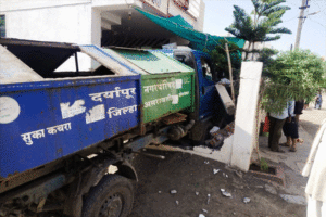 दर्यापूर : सकाळी सव्वा नऊ वाजतची वेळ. घरातील सर्व सदस्य आपल्या कामात व्यस्त. घरातील मोठी मंडळी चहा आणि वृत्तपत्र वाचण्यात दंग. बच्चे कंपनी धिंगाणा घालण्यात व्यस्त अन् काही क्षणाच्या अवधीत घरात मोठा धडाड… धुम… आवाज झाला. काही तरी मोठे घडल्याचा अंदाज आल्याने घरातील सर्वच जण धास्तीने आवाजाच्या दिशेने आले आणि बघतो तर चक्क कचर्याची गाडीच आवार तोडून घरात घुसलेली. सर्वच जण अवाक् होऊन बघू लागले. कचरा गाडीतून फाटक उघडून ड्रायव्हर बाहेर पडताच त्याच्याकडे बघण्यात सर्वच दंग! ही घटना आहे, दर्यापूरमधील साई नगर भागातील.