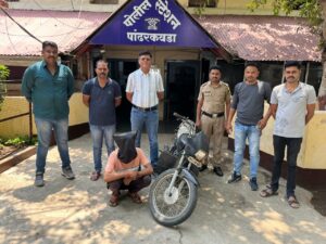 विदर्भ प्रतिनिधी संजय कारवटकर : पोलीस स्टेशन पांढरकवडा येथे दि. १६/०६/२०२४ रोजी फिर्यादी नामे अमोल प्रकाश दुधणकर वय ३६ वर्षे रा. रूंझा ता. केळापुर जि. यवतमाळ यांनी जबानी रिपोर्ट दिला की, यातील फिर्यादी हा दि. १०/०६/२०२४ रोजी सकाळी १०/३० वा चे सुमारास मोहदा येथील बँकेतुन पैसे काढण्याकरीता त्यांची काळया रंगाची ज्यास निळया पट्ट्या असलेली स्प्लेंडर प्लस मोसा क. MH 31 BX 3352 ची गाडी घेवुन मोहदा येथे जावुन तेथील ग्रामपंचायत समोर गाडी उभी करून बँकेतील काम संपवुन दुपारी १२/०० वा बाहेर आला असता ग्रामपंचायत समोर ठेवलेली कोणातरी अज्ञात चोरटयाने चोरून नेल्याचे लक्षात आल्याने पोलीस स्टेशन पांढरकवडा येथे तक्रार केली असता मा. पोलीस निरीक्षक श्री. दिनेश झांबरे यांचे मार्गदर्शनात पोउपनि योगेश रंथे व त्यांचे पथकाने कौशल्यपुर्ण तपास करून यातील आरोपी नामे मयुर दिलीप खडसे वय २४ वर्षे रा. मंगी पोस्ट दहेगाव ता. राळेगाव याचे नाव निष्पन्न करून पोस्टे वडकी पोलीसांचे मदतीने आरोपीचा शोध घेतला असता आरोपी हा त्याचे राहते गावी मंगी येथे चोरीतील मोटार सायकल क. MH 31 BX 3352 सह घरी हजर मिळुण आला असता चोरीतील मोटारसायकल तसेच आरोपीस ताब्यात घेवुन पोलीसांनी आरोपीस अटक केले आहे.