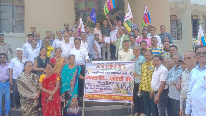 कोरचा : सर्वोच्च न्यायालयाने नुकतेच अनुसूचित जाती व अनुसूचित जमातीच्या उपवर्गीकरणाच्या निर्णय दिलेला आहे. याच्या विरोधासह इतर मागण्यासादर्भात कोरची तालुक्यातील अनुसूचित जाती जमाती संघर्ष समितीच्या शेकडो नागरिकांच्या वतीने २१ ऑगस्ट बुधवार रोजी कोरची तालुक्यातील बाजारपेठ कडकडीत बंद ठेवून निर्णयाचा विरोध दर्शवून शहरात निदर्शने केली त्यानंतर विविध मागण्या संदर्भात कोरची तहसीलदारामार्फत भारताचे राष्ट्रपती व पंतप्रधानांना निवेदन पाठवण्यात आले आहे.