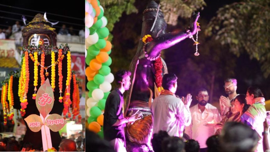 नांदगाव पेठ : श्रावण मासाचे औचित्य साधून भोलेनाथ क्रीडा व शिक्षण प्रसारक मंडळाच्या वतीने २६ ऑगस्ट रोजी काढण्यात आलेल्या कावड यात्रेने संतनगरी नांदगाव पेठ भक्तीमय झाले होते. संगमेश्वर मंदिर येथून जल घेऊन ही कावड यात्रा प्रारंभ झाली आणि भोलेनाथ चौक येथील मंदिरात जलार्पण करून कावड यात्रेचा समारोप करण्यात आला. छत्रपती शिवाजी महाराज चौकात भोलेनाथांच्या प्रतिमेसमोर आ. यशोमती ठाकूर यांच्या हस्ते महाआरती करण्यात आली. यावेळी भक्तांमध्ये उत्साह संचारला होता.