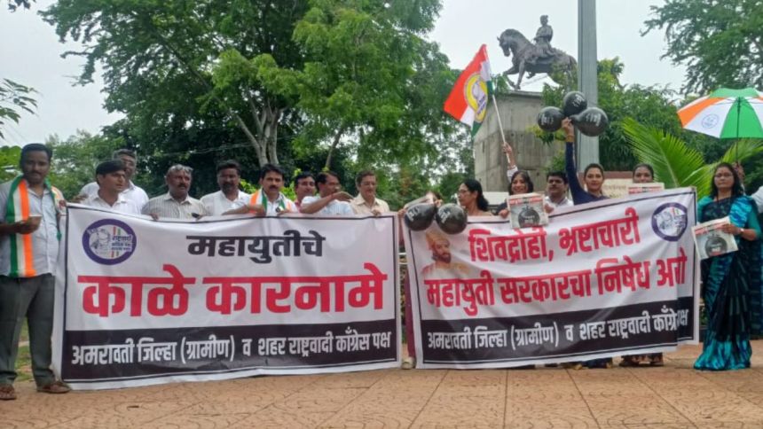 अमरावती : राज्यातील महायुती सरकारच्या काळात सुरु असलेला अमाप भ्रष्टाचार व महाराष्ट्राचे दैवत असलेल्या छत्रपती शिवाजी महाराजांच्या पुतळ्याची झालेली अवहेलना याविरोधात आज अमरावती जिल्हा ग्रामीण व शहर राष्ट्रवादी काॅग्रेस (शरदचंद्र पवार) पक्षाच्या वतीने आज स्थानिक मालटेकडी परिसरातील शिवपुतळ्यानजीक महायुतीसरकार विरोधात जोरदार निदर्शने करण्यात आली.